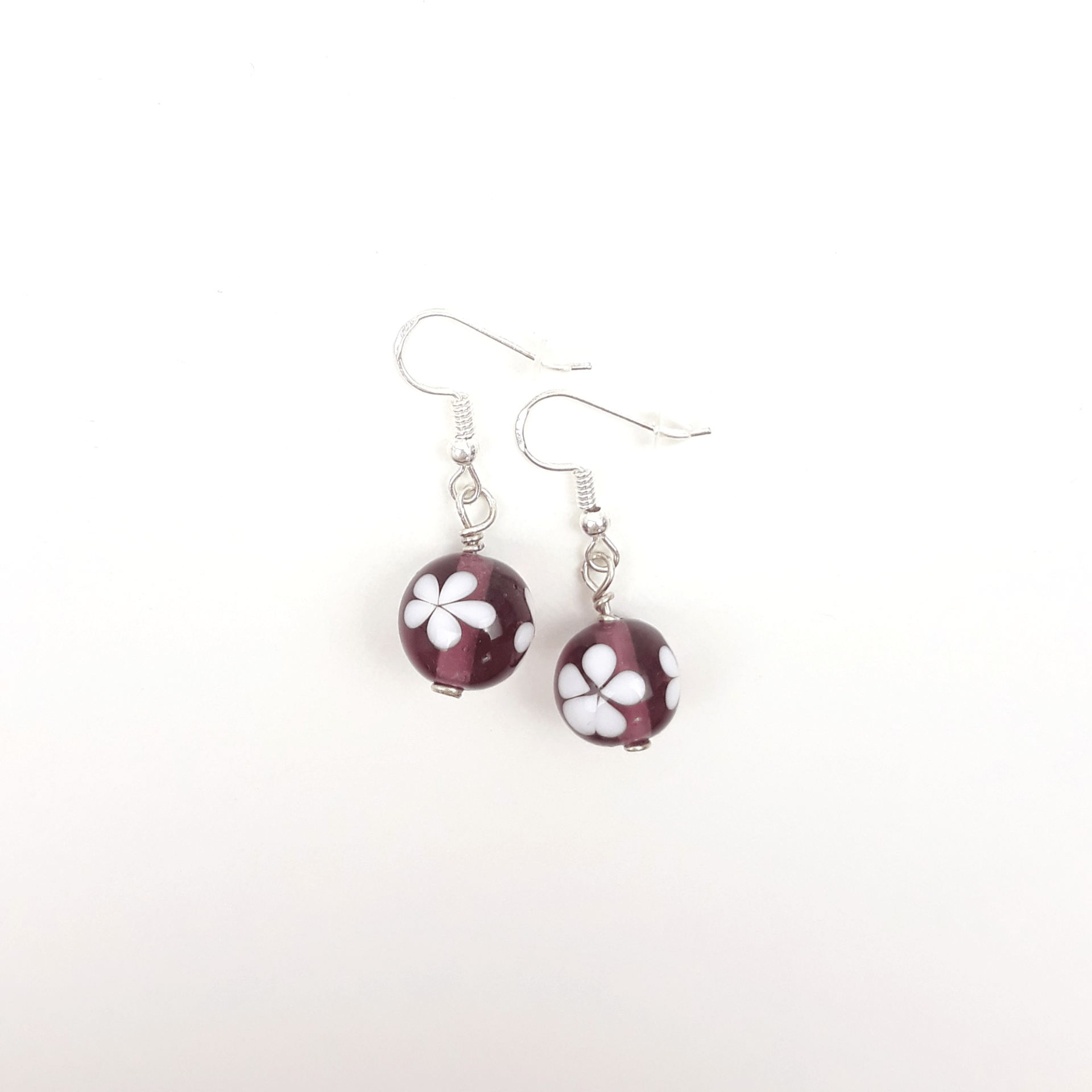 Ohrringe aus handgedrehten Glasperlen in transparentem lila mit weißen Blümchen.