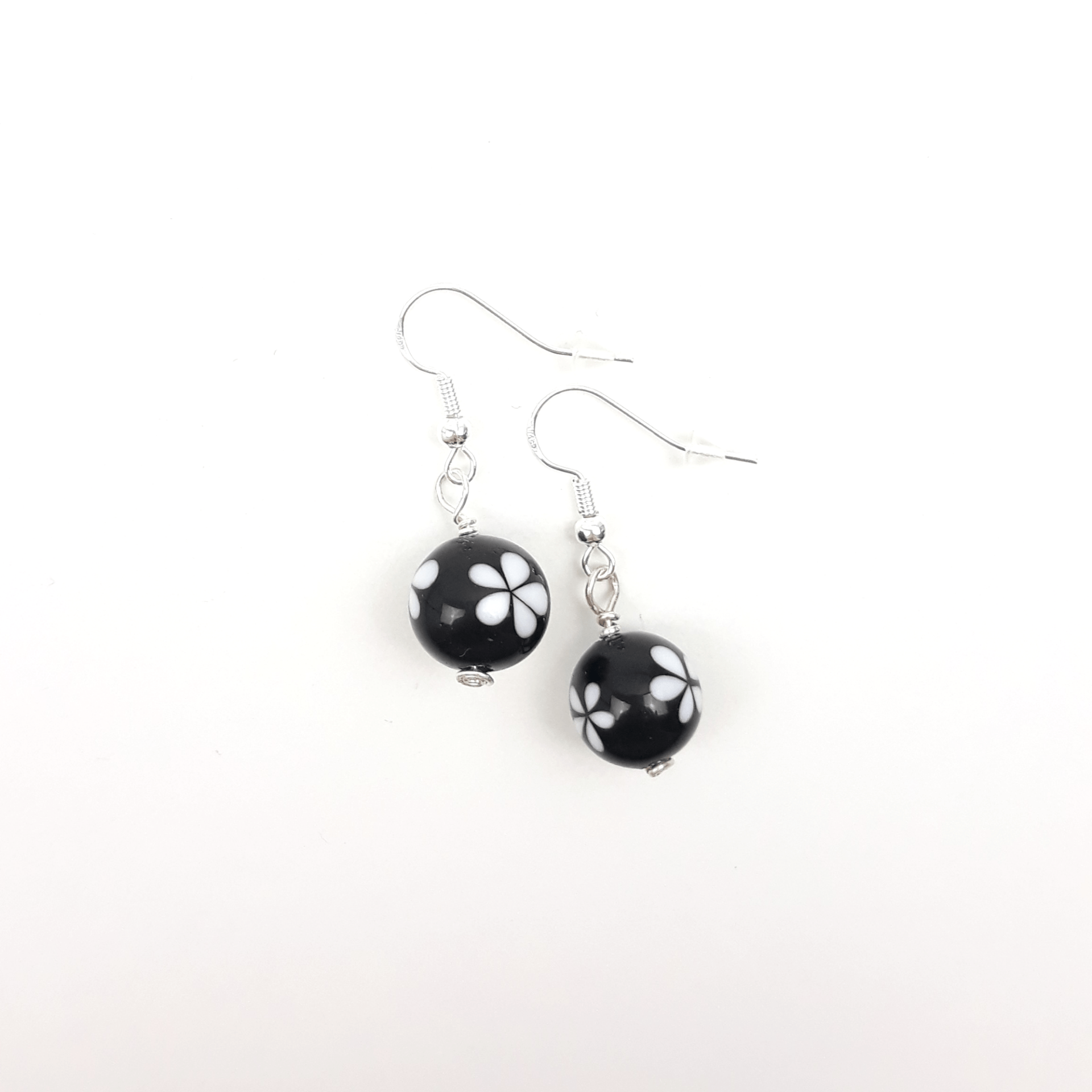 Ohrringe aus handgedrehten Glasperlen in schwarz mit weißen Blümchen.