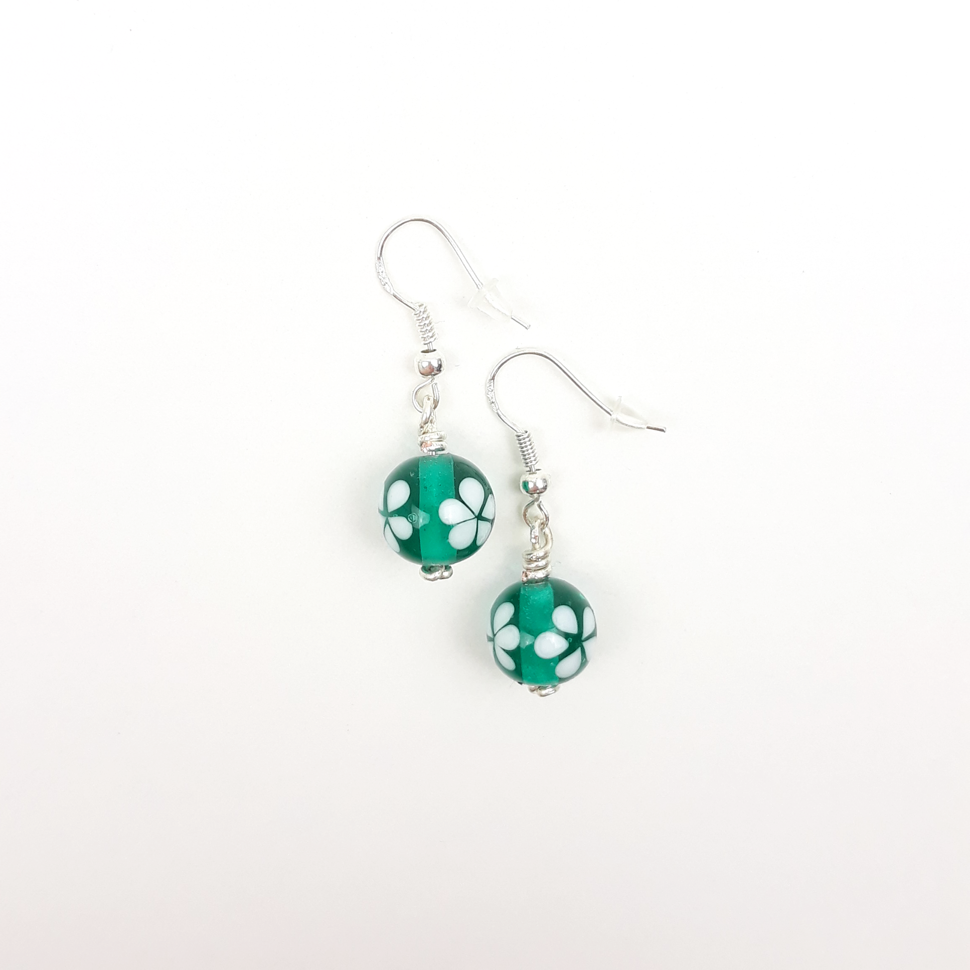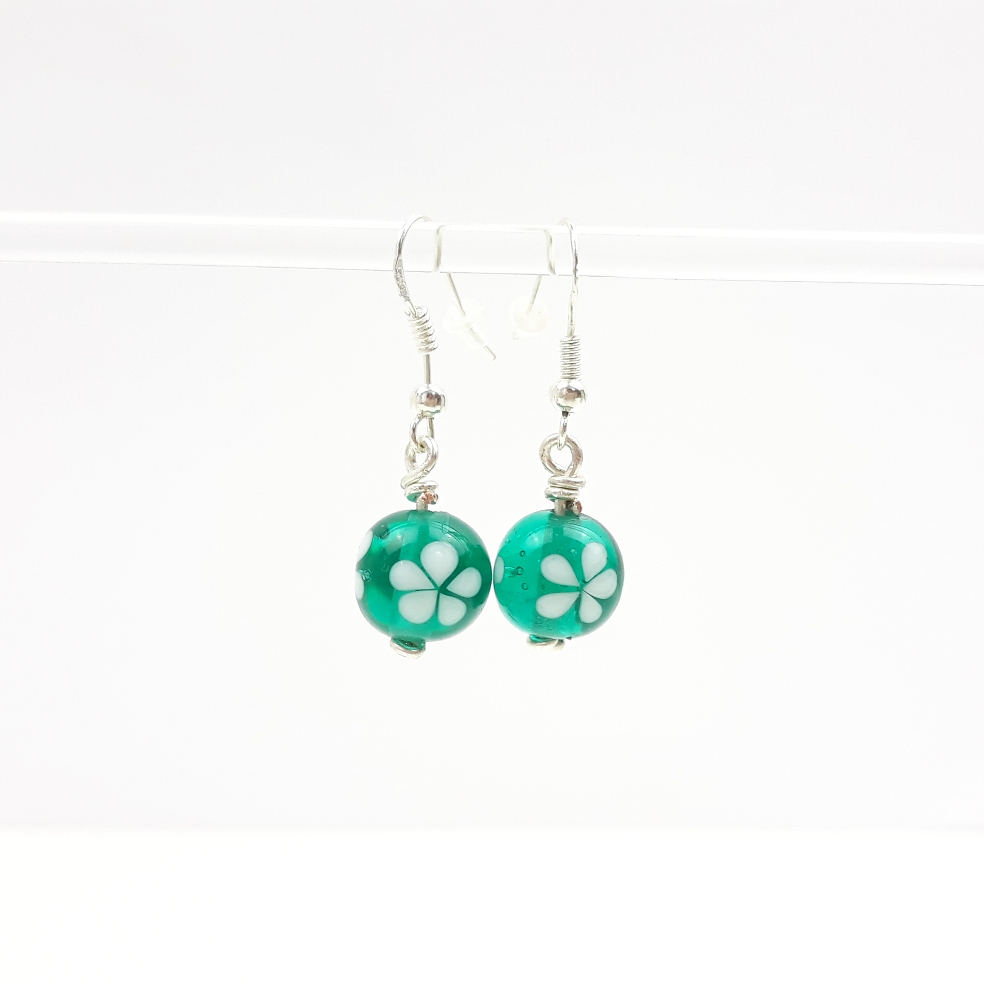 Ohrringe aus handgedrehten Glasperlen in transparentem türkis mit weißen Blümchen.