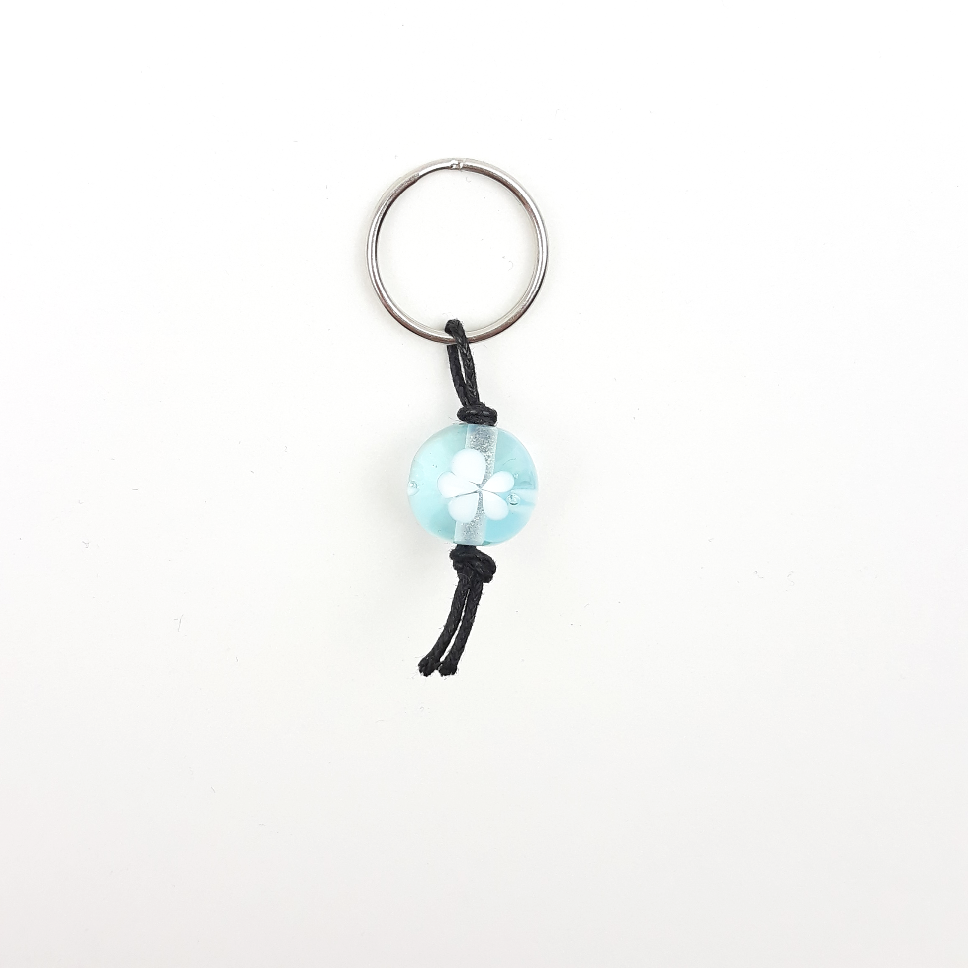Ein Zipper oder Schlüsselanhänger aus einer handgedrehten Glasperle in transparentem hellblau mit weißen Blümchen.