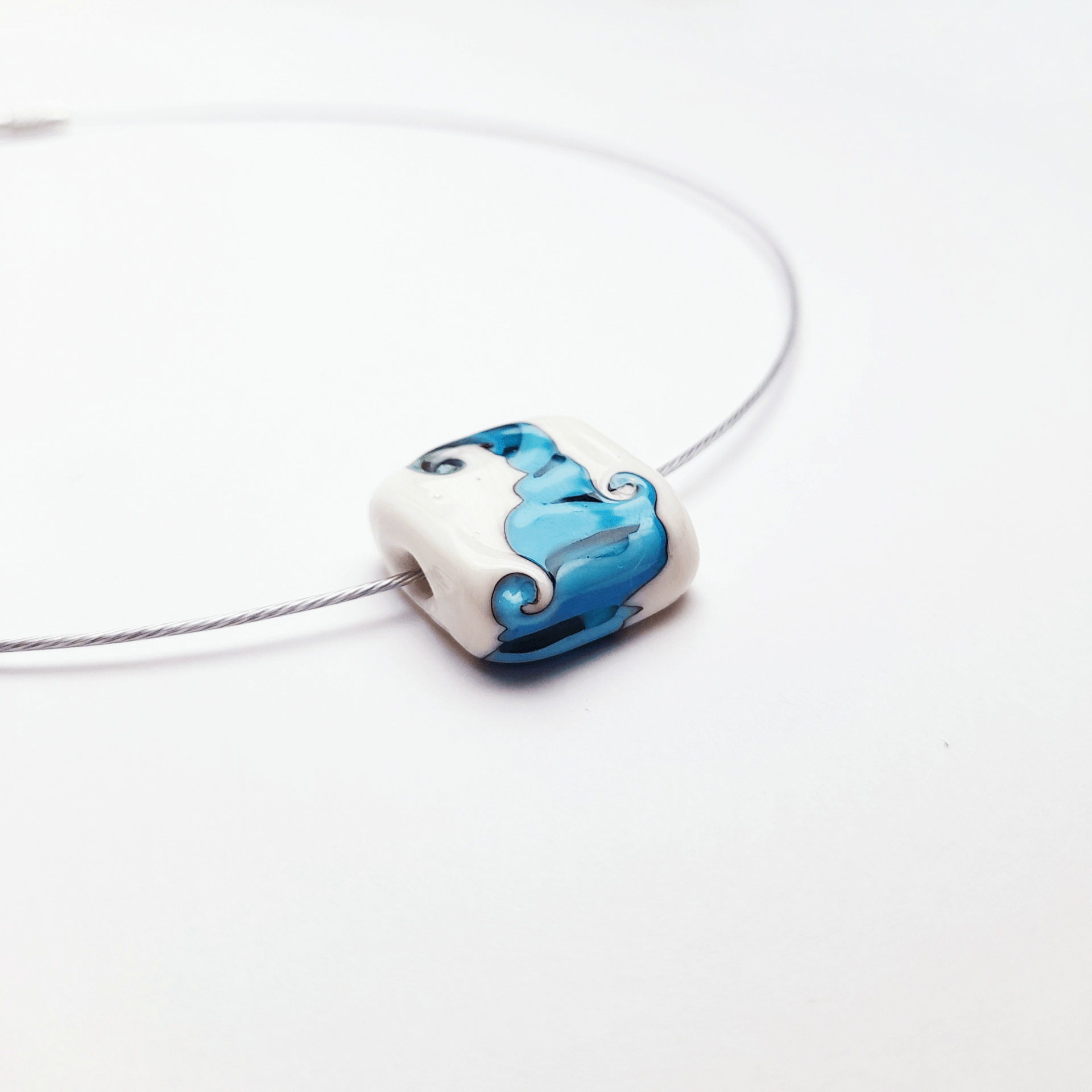 Der Vorteil der flachen Form der Glasperle ist, dass die Glasperle als Kettenanhänger gut auf der Haut aufliegt und nicht drückt oder sich dreht.