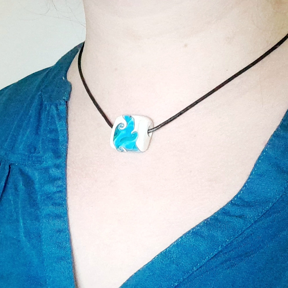 Die Glasperle kann als Kettenanhänger auf einem Edelstahlcollier oder einer Lederkette getragen werden.
