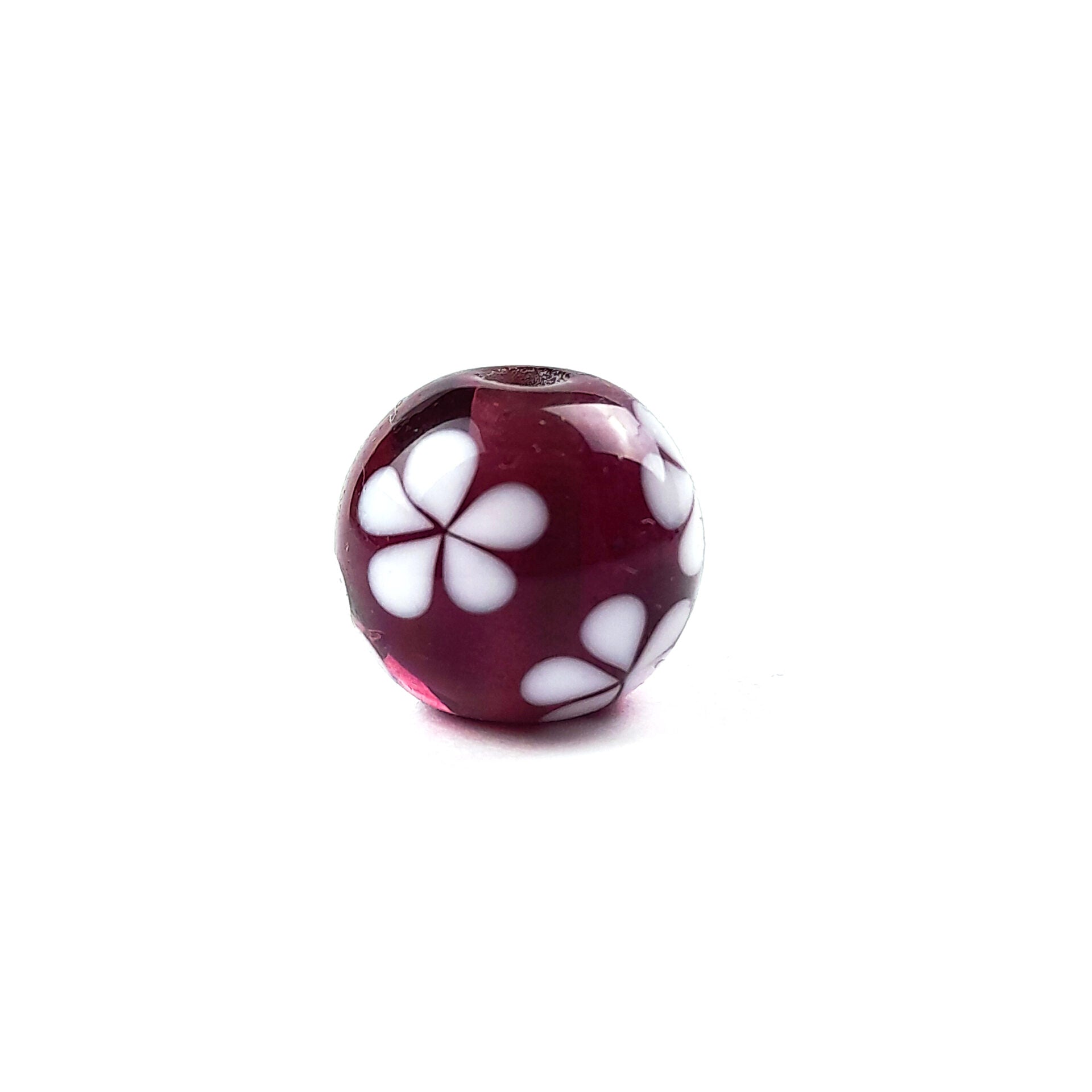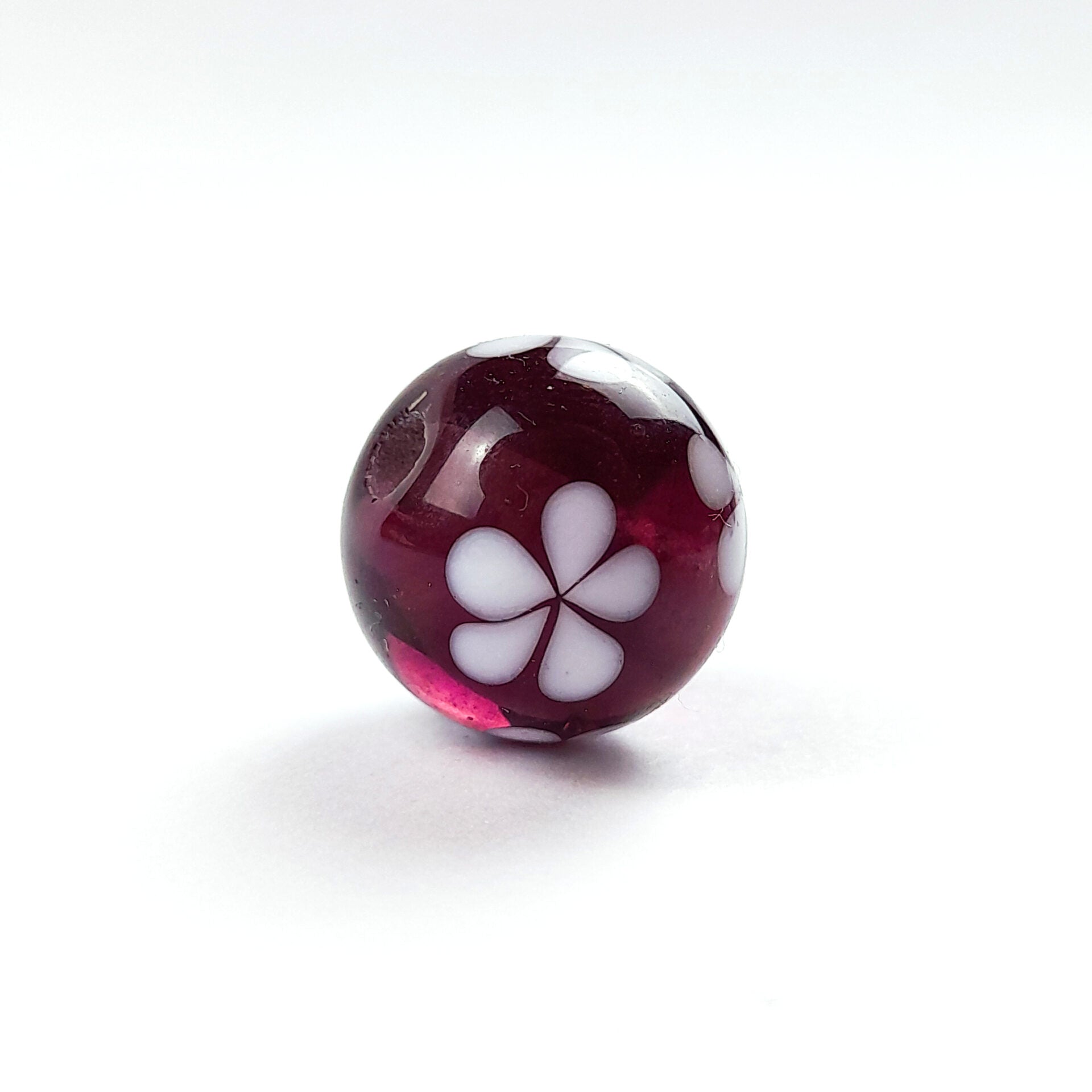 Diese Glasperle in transparentem lila mit einem weißen Blütenmuster ist in drei verschiedenen Größen erhältlich. Die Glasperle kann von Dir zu einem individuellen Schmuckstück verarbeitet werden. Durch ein selbstgemachtes Schmuckstück kannst Du Deine Freude an Deiner Kreativität und Deine Einzigartigkeit zum Ausdruck bringen.