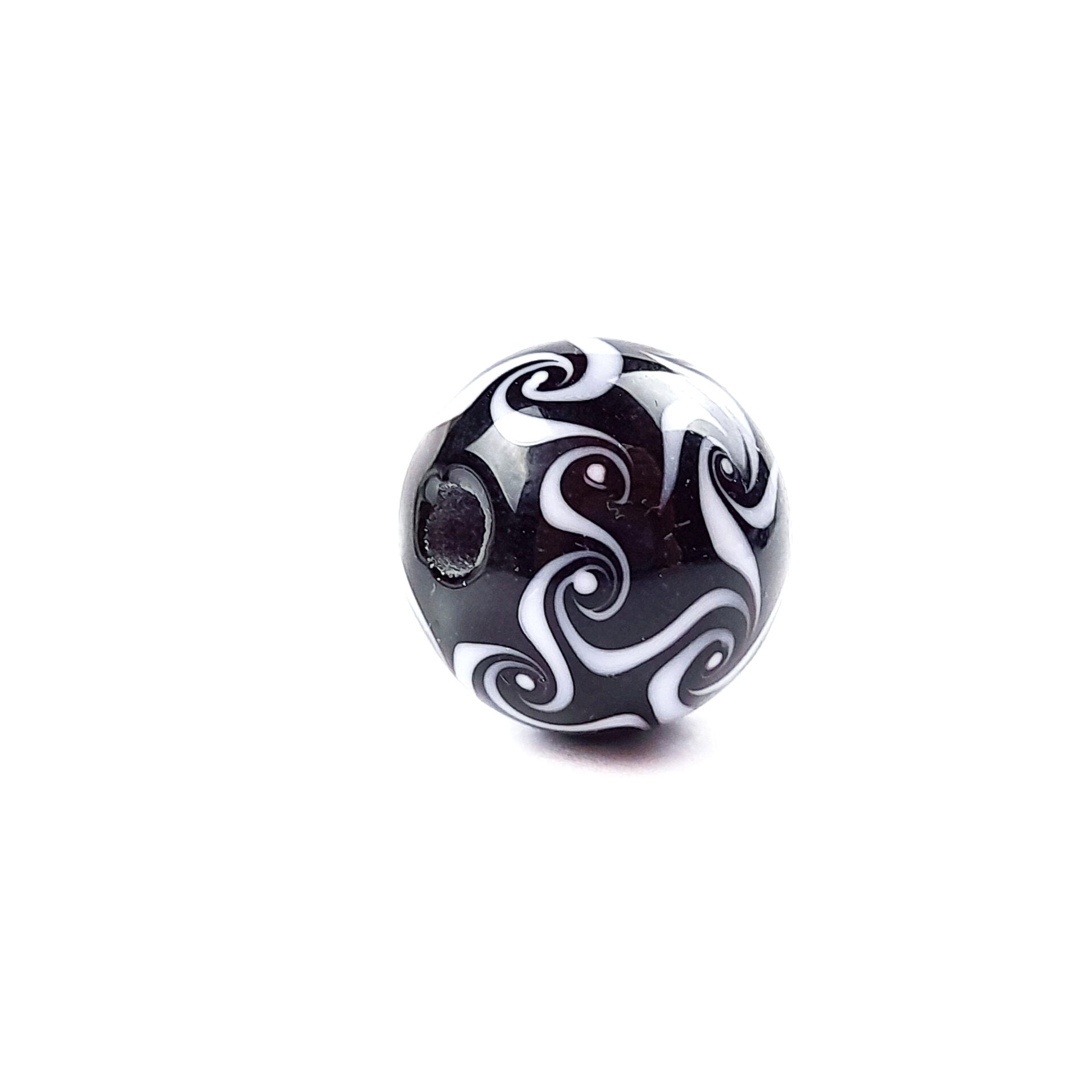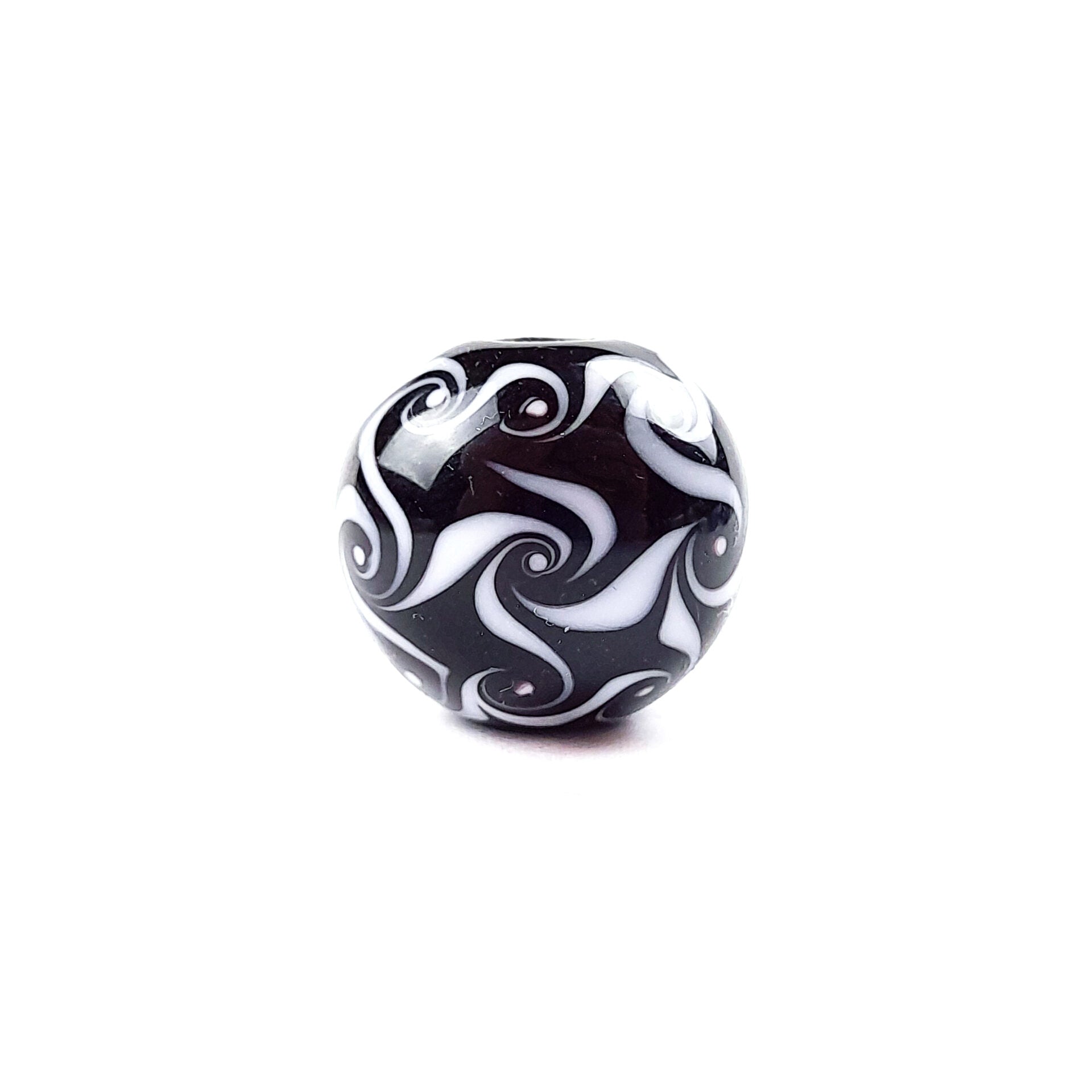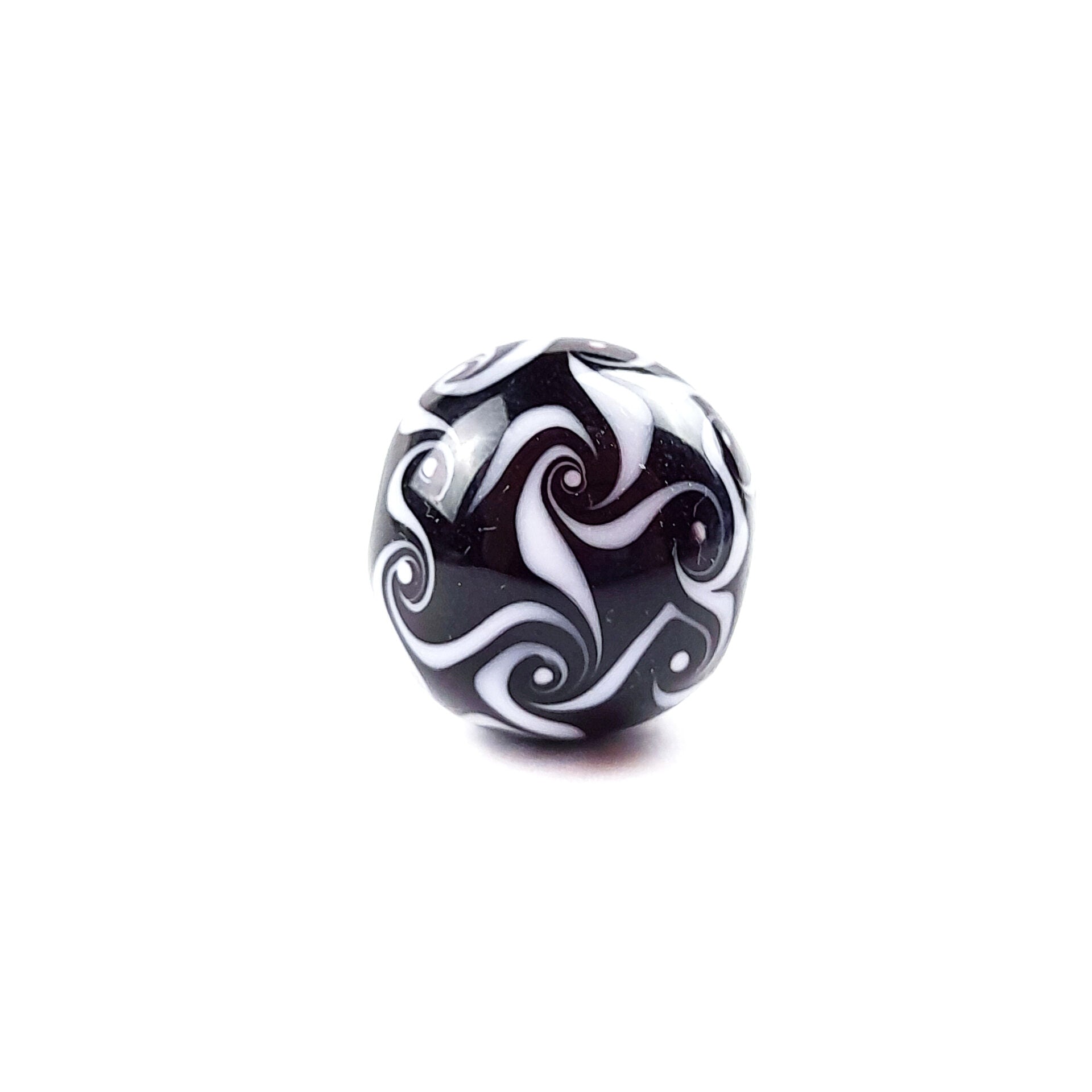 Mit dieser Glasperle in schwarz mit einem weißen Wirbel-Muster kannst Du zu einem besonderen Schmuckstück verarbeiten und dadurch Deine Freude an Deiner Kreativität und deine Einzigartigkeit zum Ausdruck bringen.