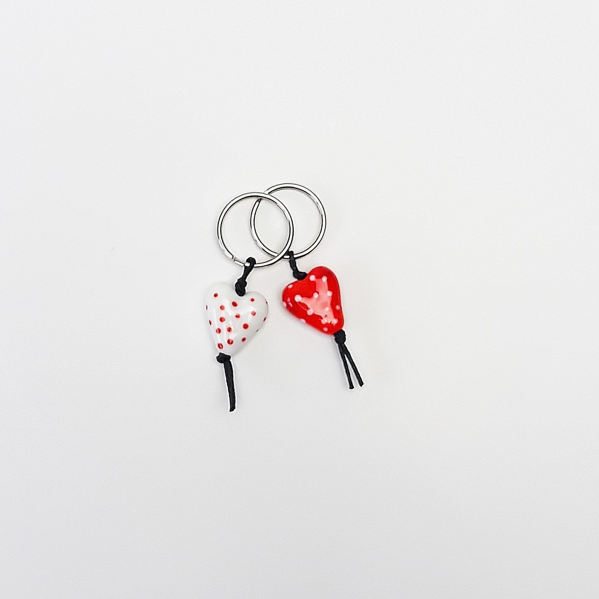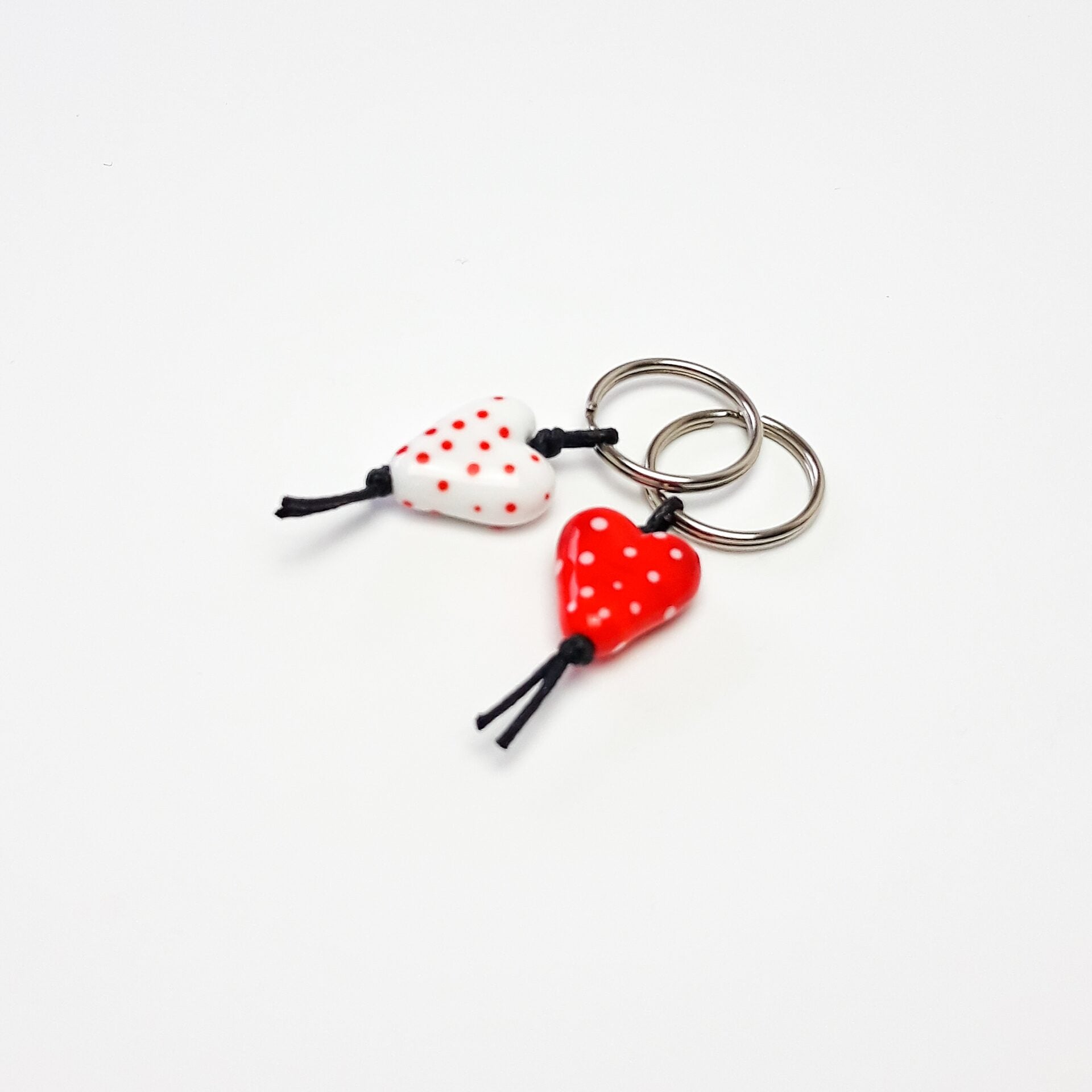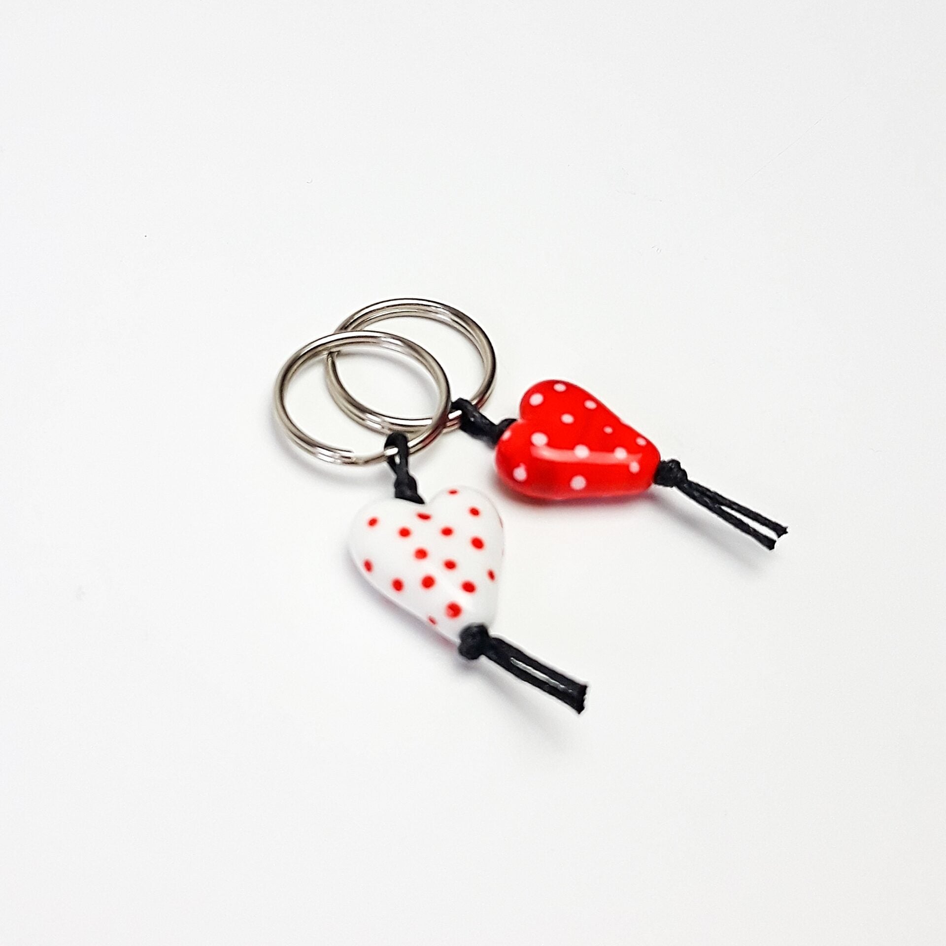 Zwei handgedrehte Glasperlen als Herzen in rot und weiß mit Punkten als Schlüsselanhänger.