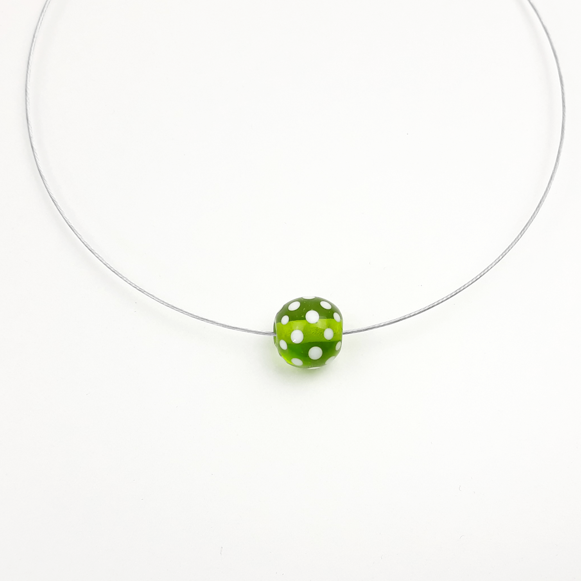 Eine handgedrehten Glasperle als Kette in transparentem grün mit weißen Punkten.