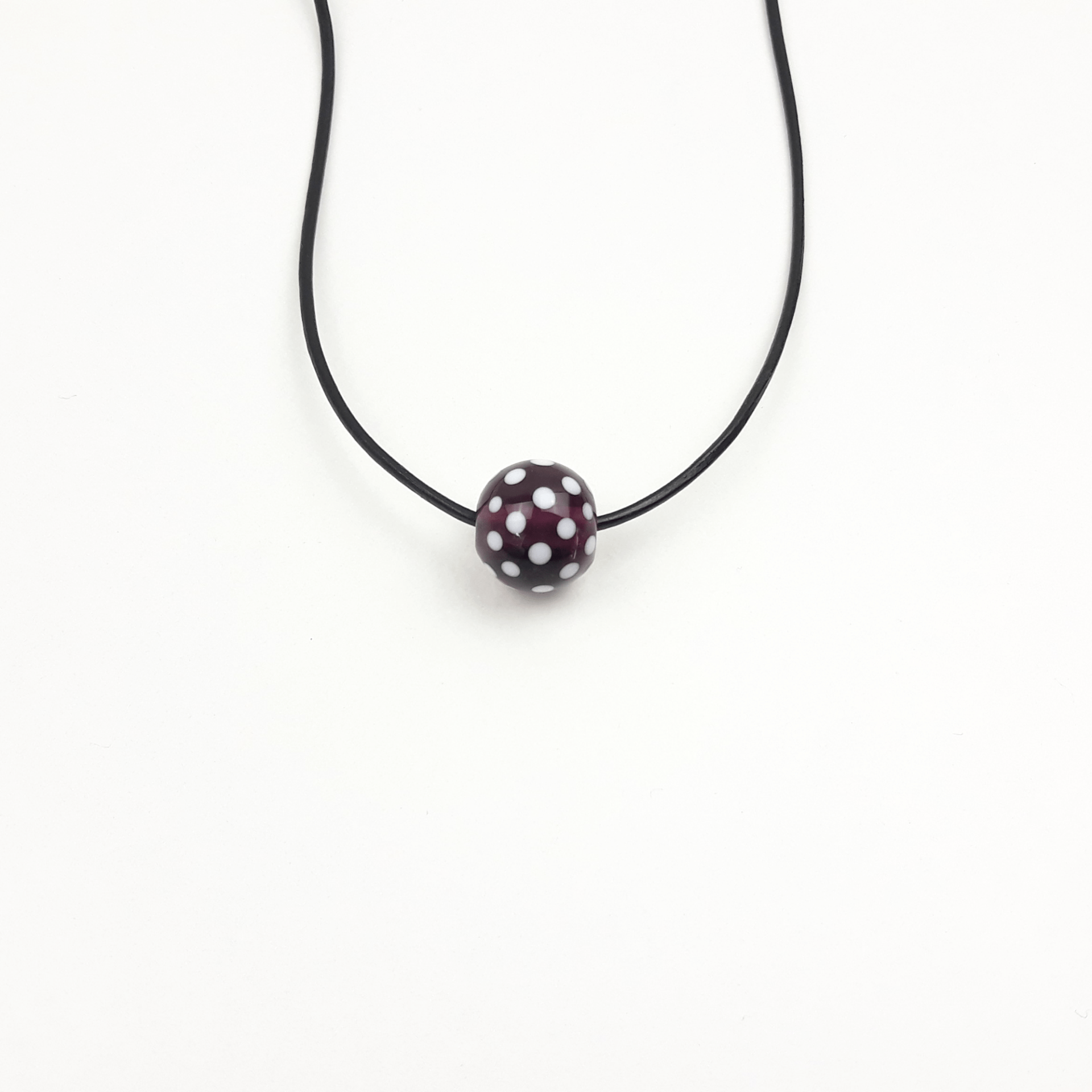 Eine handgedrehten Glasperle als Kette in transparentem lila mit weißen Punkten als Muster.