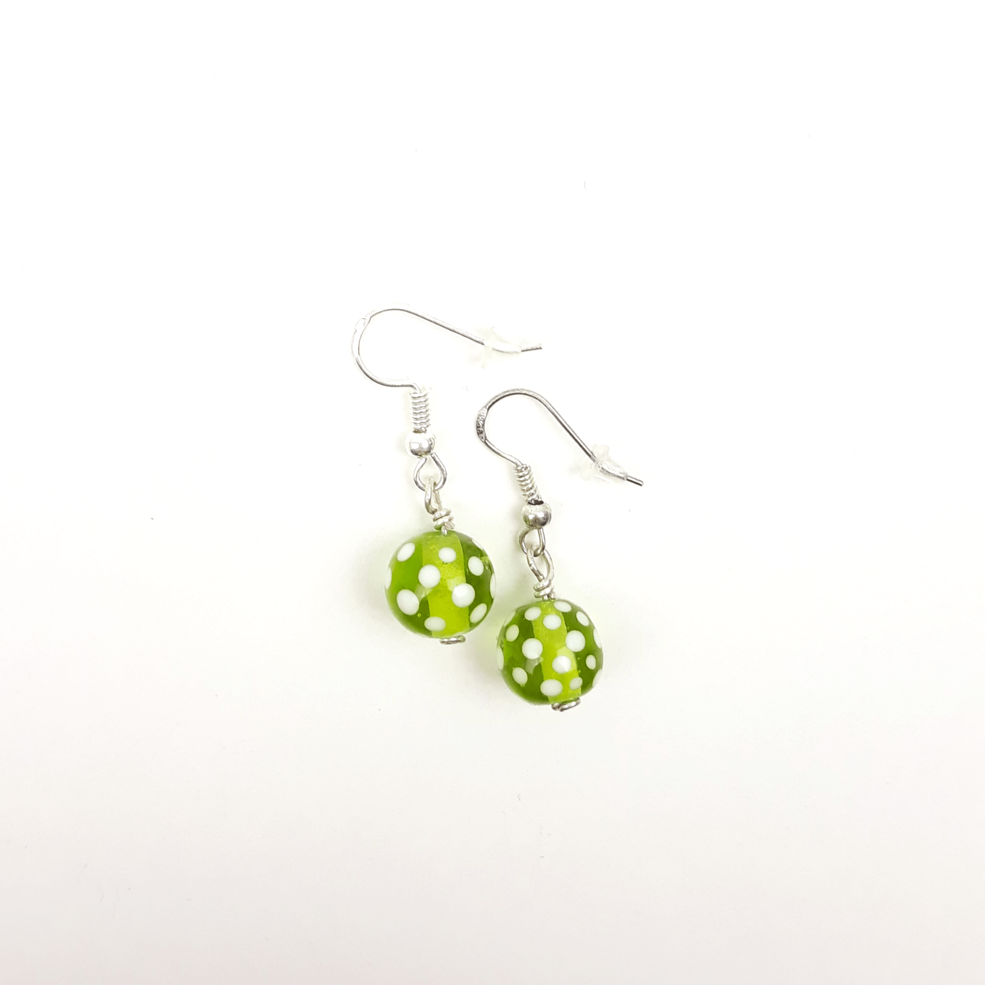 Ohrringe aus handgedrehten Glasperlen in transparentem grün mit weißen Punkten.