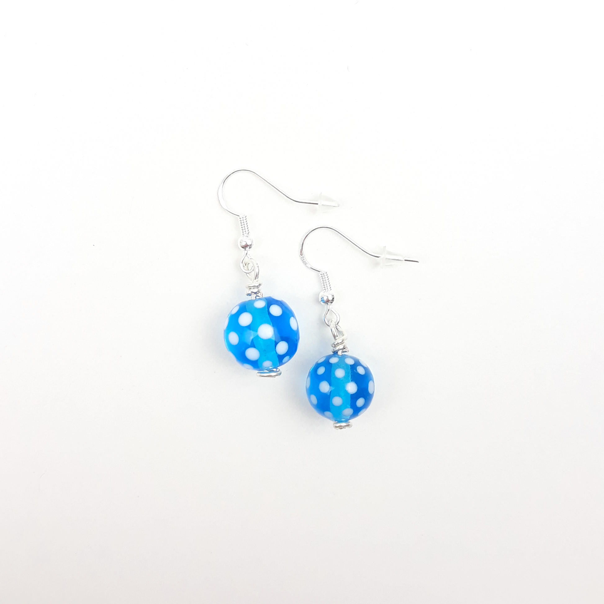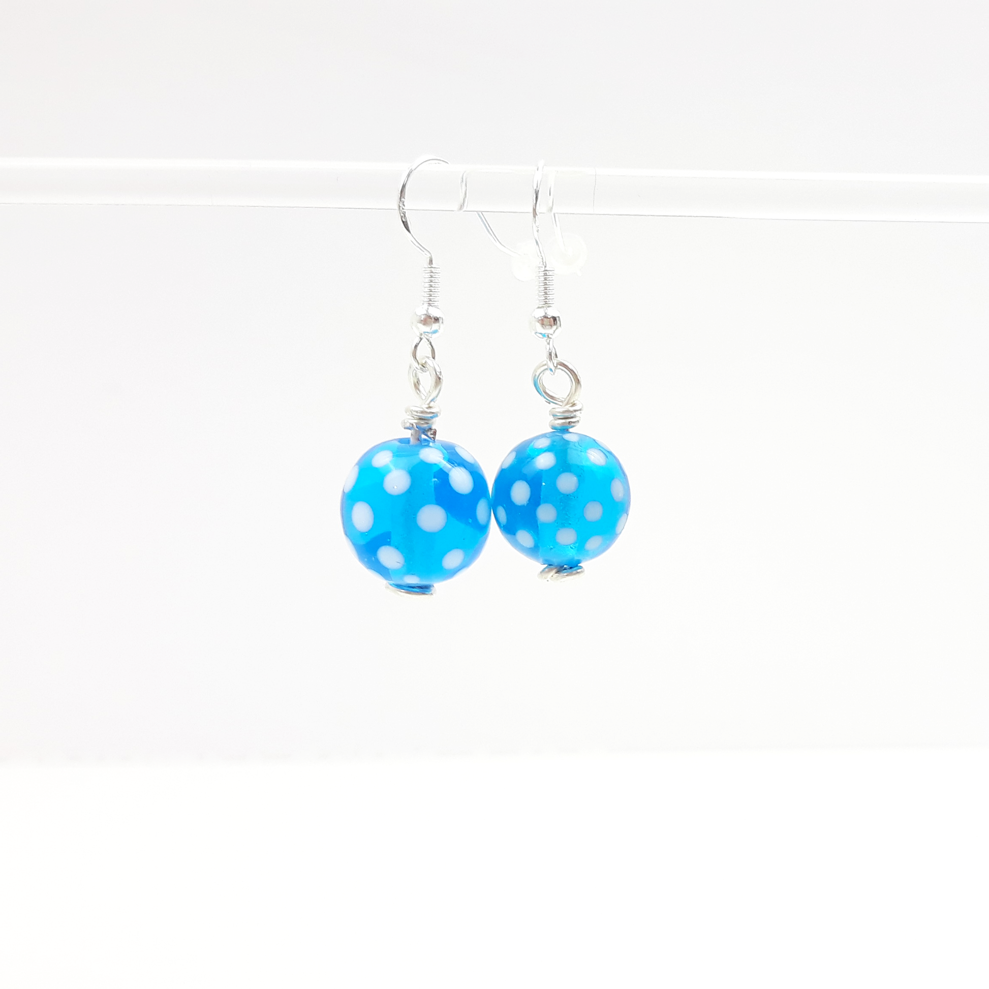 Ohrringe aus handgedrehten Glasperlen in transparentem hellen türkis mit weißen Punkten.