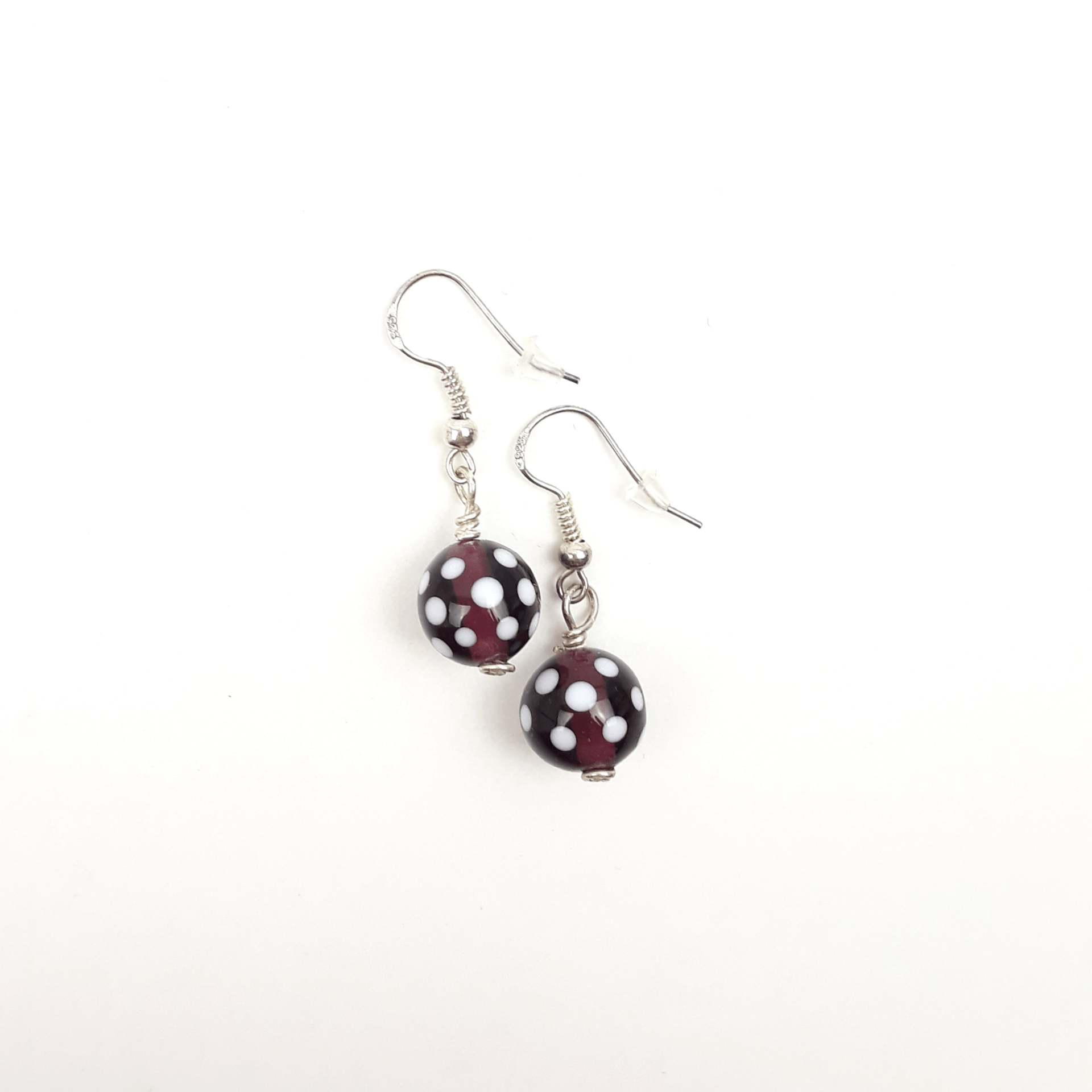 Ohrringe aus handgedrehten Glasperlen in transparentem lila mit weißen Punkten.