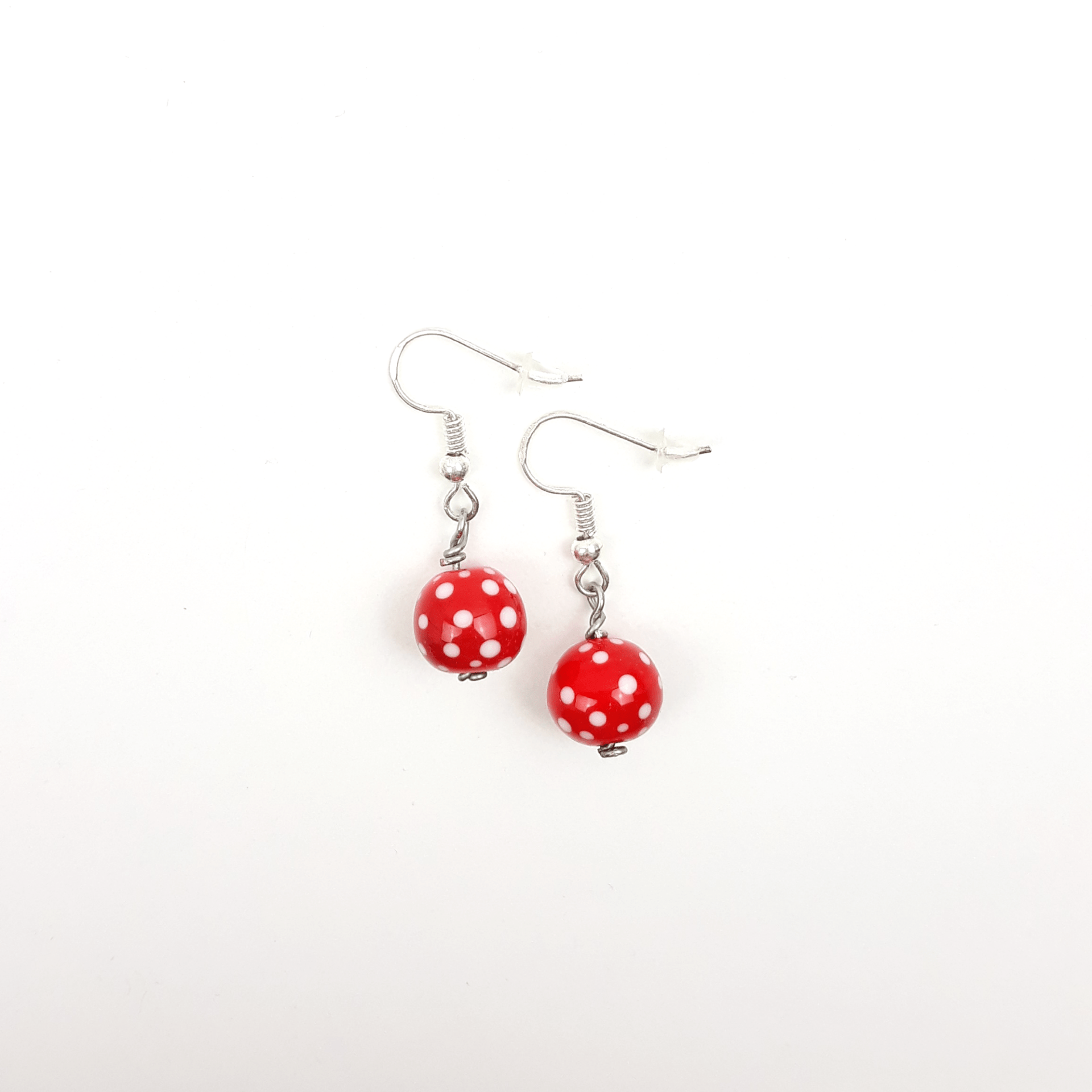 Ohrringe aus handgedrehten Glasperlen in rot mit weißen Punkten.