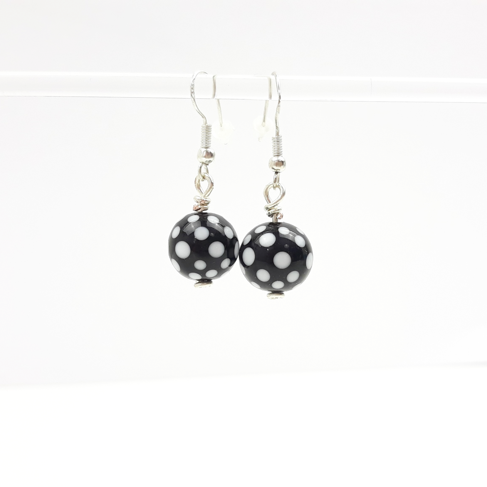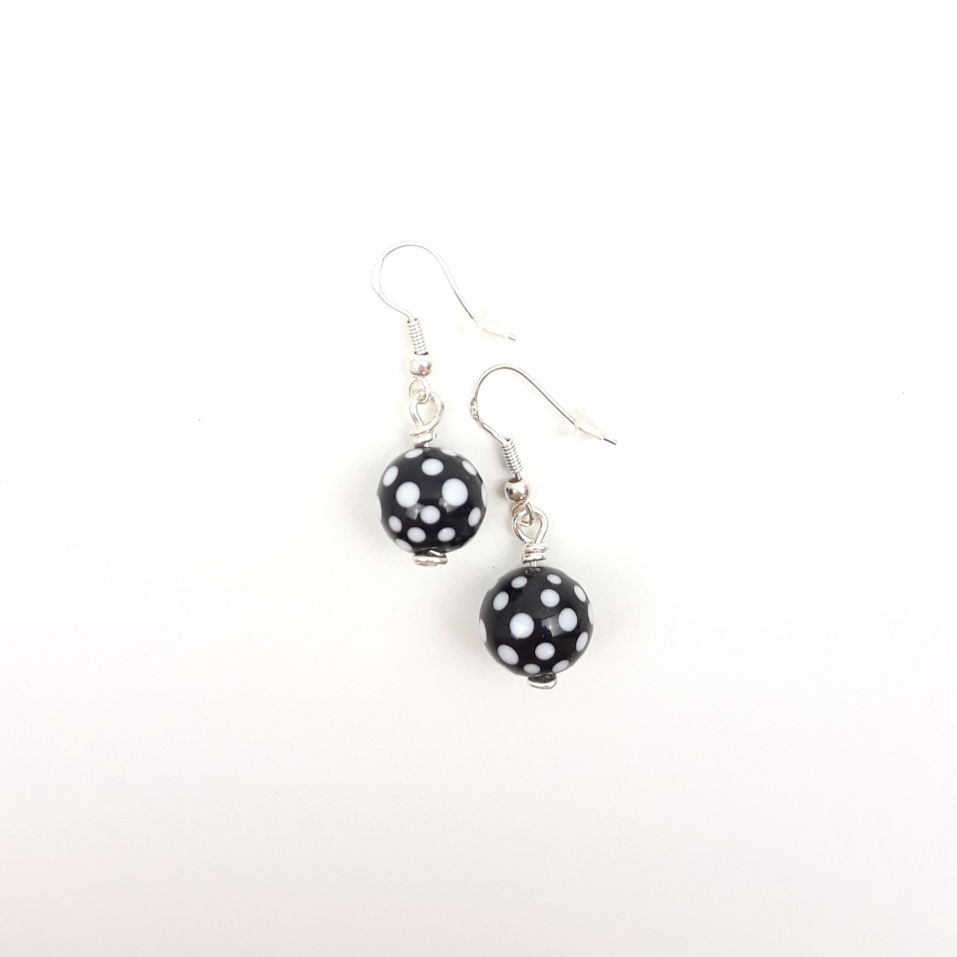 Ohrringe aus handgedrehten Glasperlen in schwarz mit weißen Punkten.