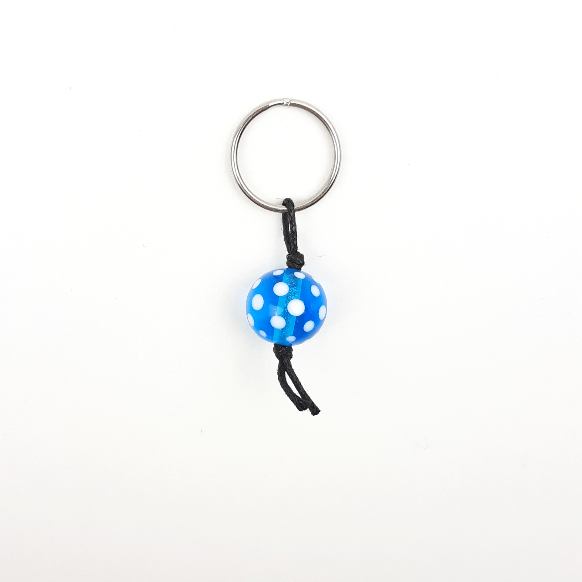 Ein Zipper oder Schlüsselanhänger aus einer handgedrehten Glasperle in transparentem hellem türkis mit weißen Punkten.