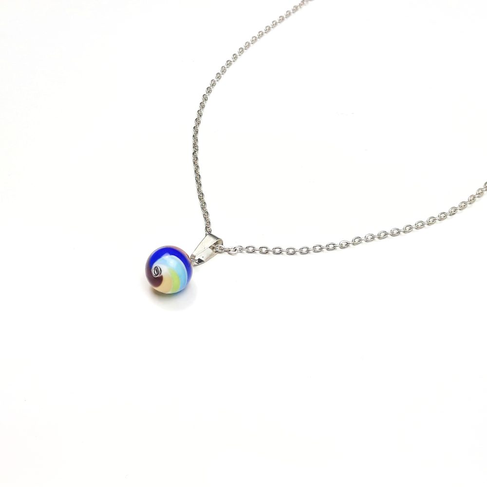 Eine handgedrehte Glasperle in Regenbogenfarben auf einer feinen Silberkette: