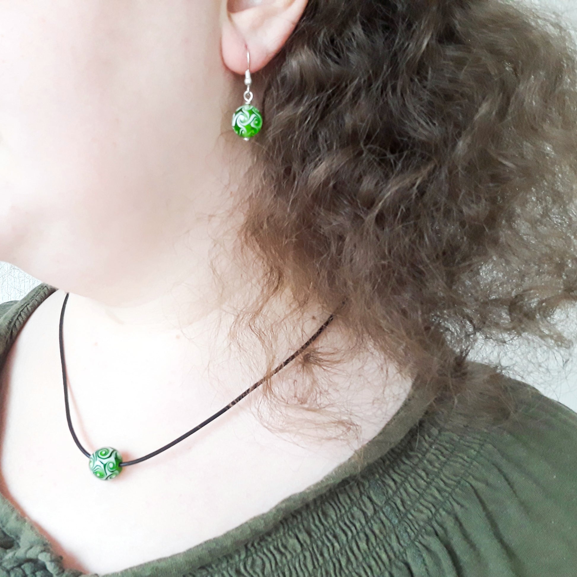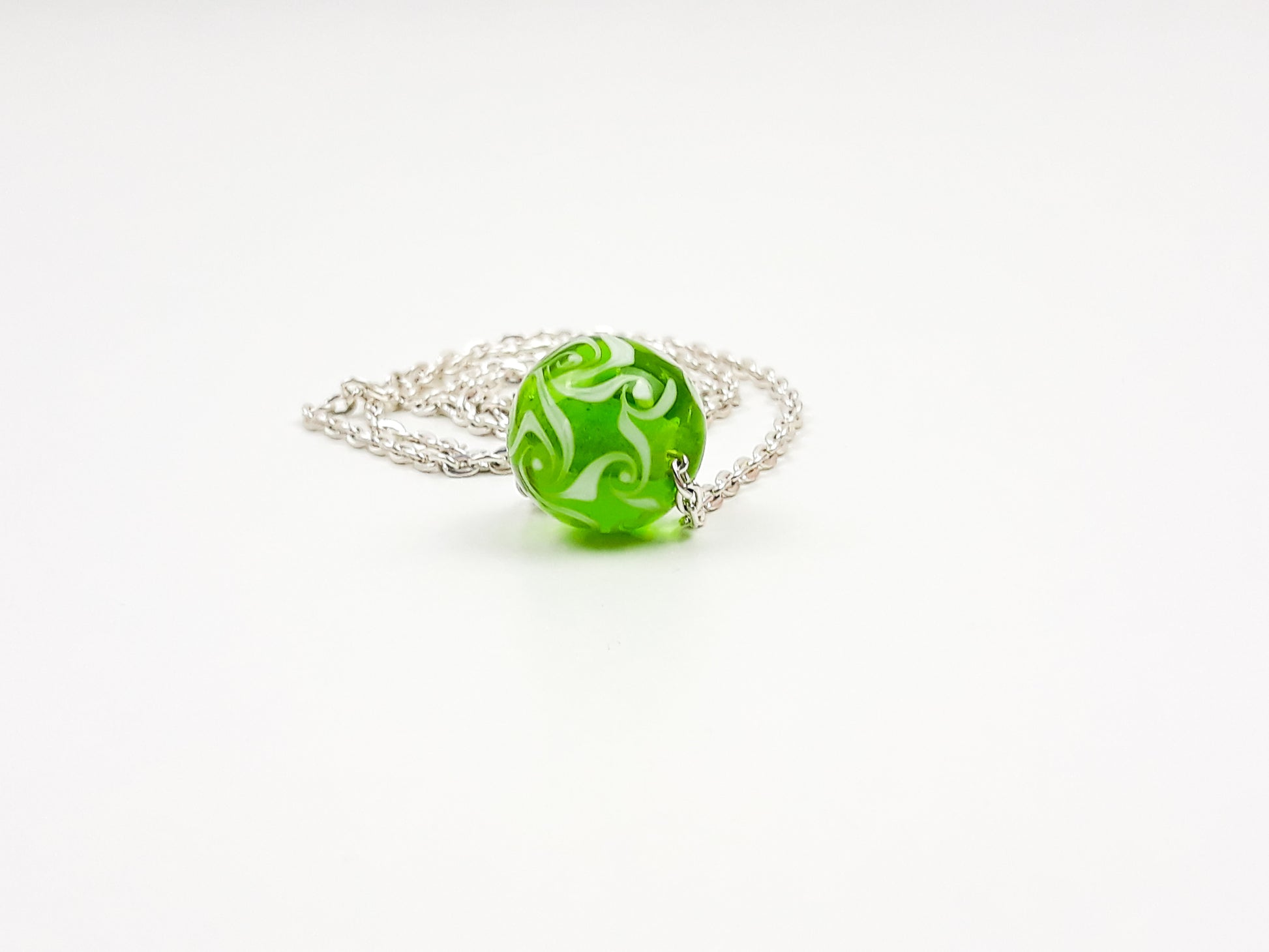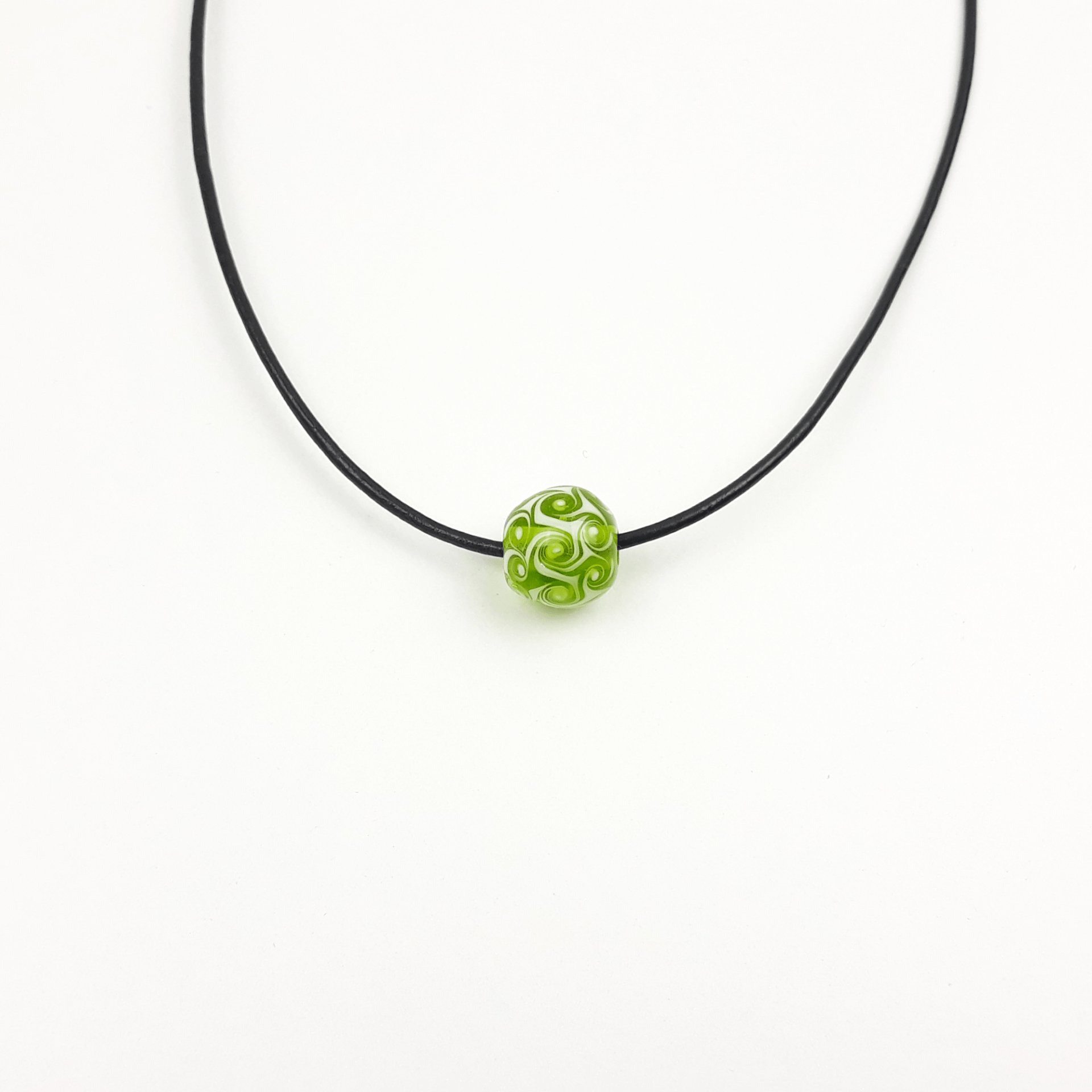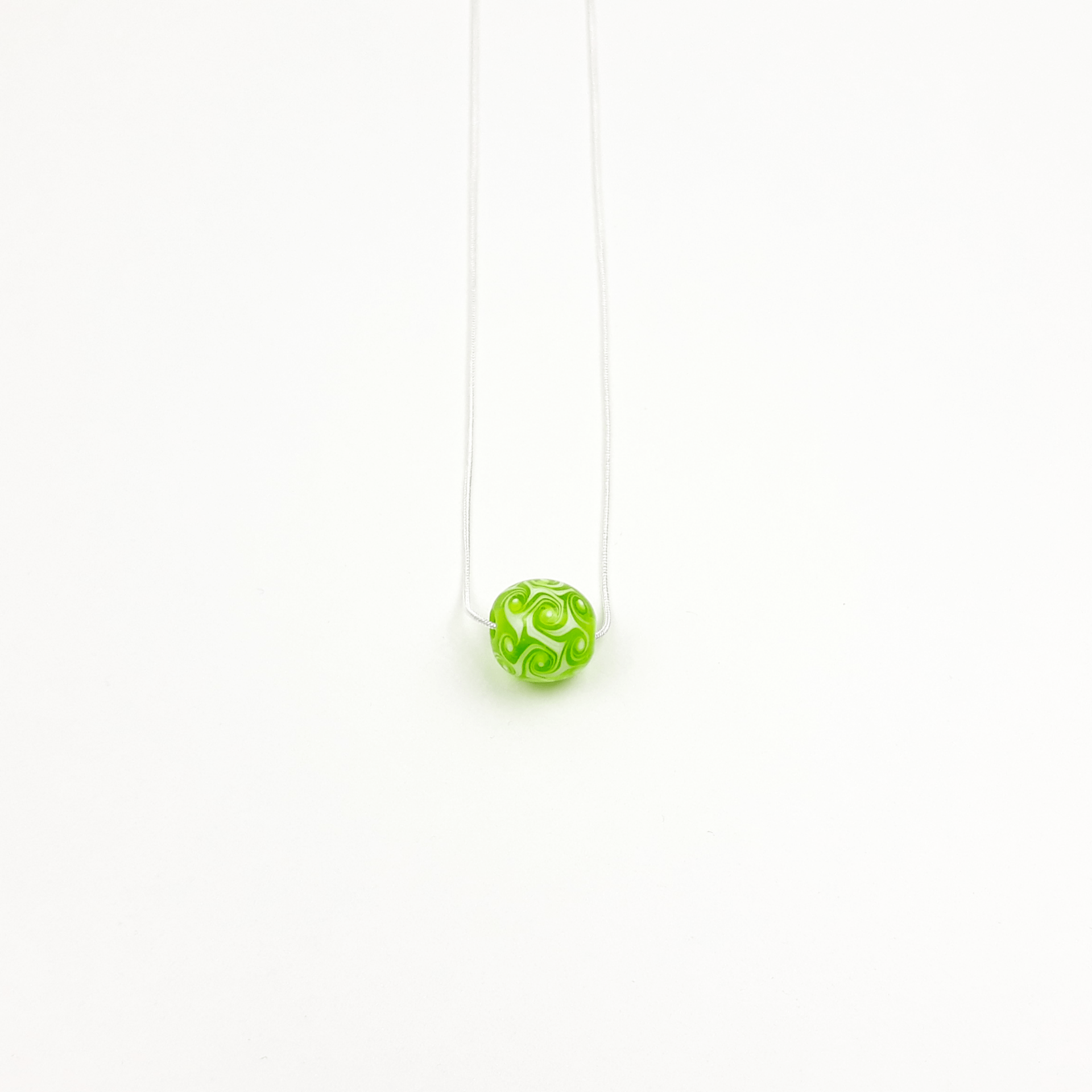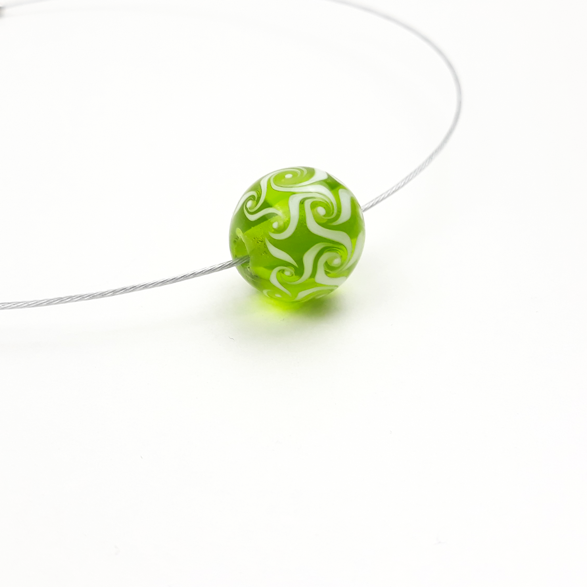 Eine handgedrehten Glasperle als Kette in transparentem grün mit weißen Wirbeln als Muster.