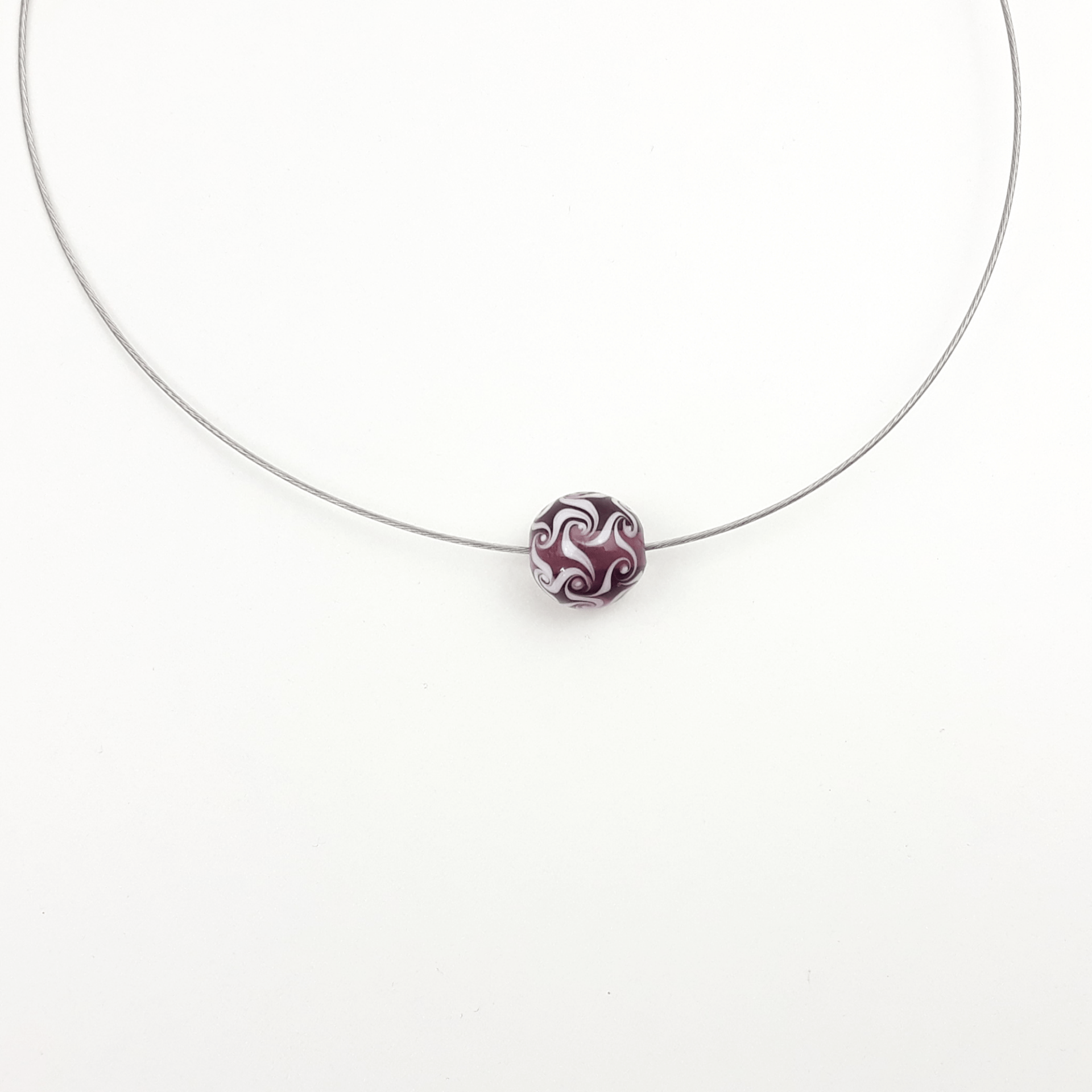 Eine handgedrehten Glasperle als Kette in transparentem lila mit weißen Wirbeln als Muster.