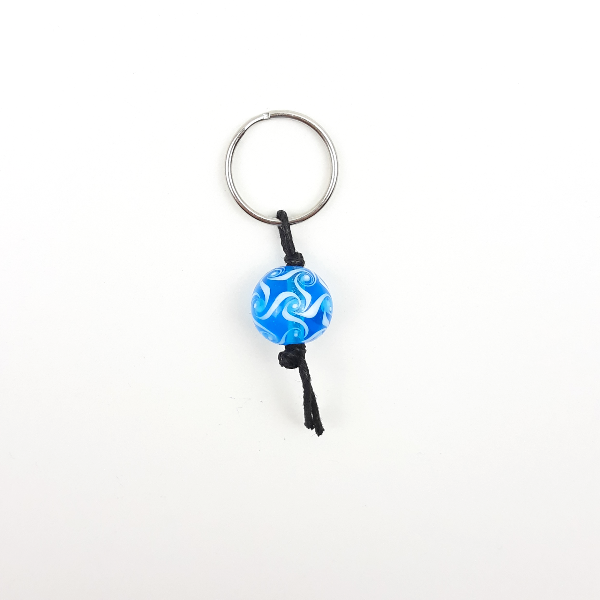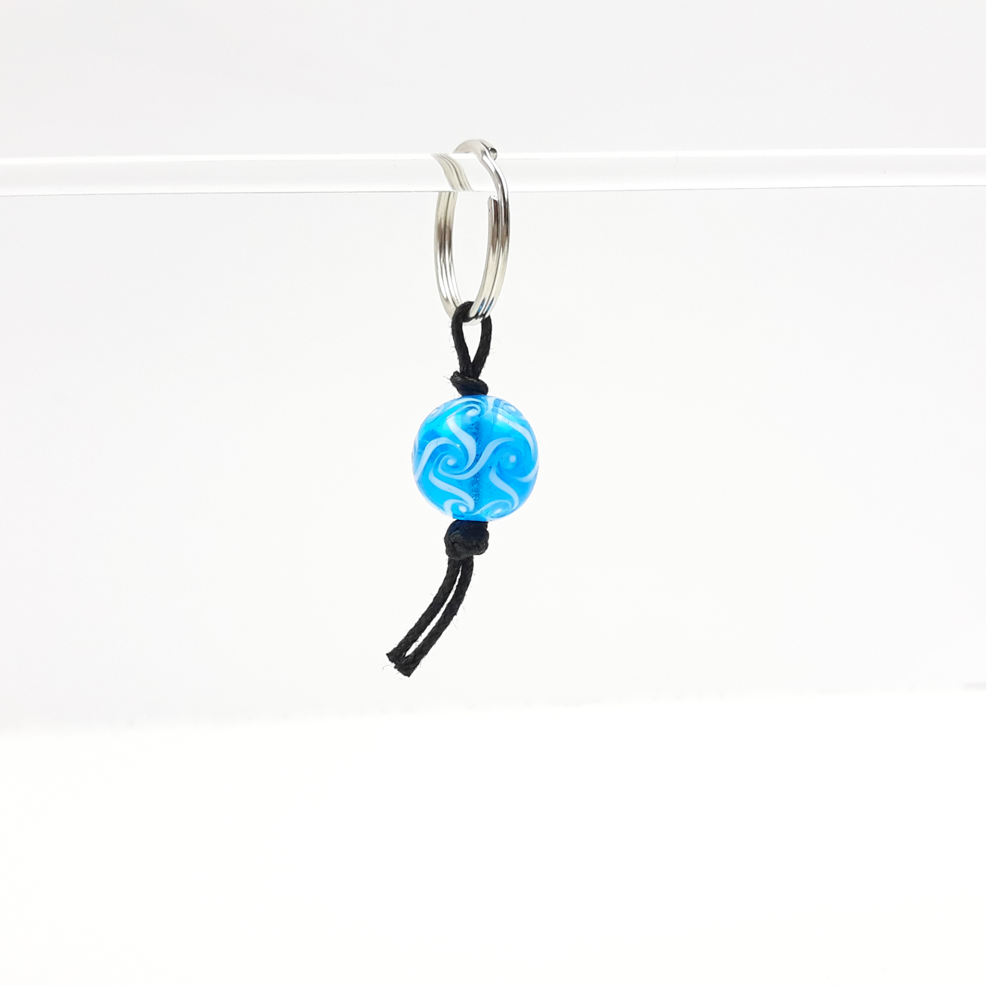 Ein Zipper oder Schlüsselanhänger aus einer handgedrehten Glasperle in transparentem hellem türkis mit weißen Wirbeln als Muster.